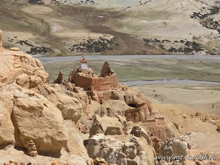 Кроме того, на входе в южную долину и вдоль западно-восточной долины обнаружены камни мани и несколько групп ступ. Четыре группы ступ довольно хорошо сохранились. Они выстроены из глиняных кирпичей, строительного раствора и глины. Можно различить основание и корпус ступ. Основания имеют квадратную форму. Они сделаны из осколков камней и глиняных кирпичей и сужаются по мере увеличения высоты. Корпусы ступ также сооружены из глиняных кирпичей с тонким камнем-плитняком между слоями. Внутри ступы полые. Внешняя часть ступы обмазана слоем глинистого раствора, а поверх него нанесен еще один слой красного цвета. Сохранилась секция в средней части ступы. Средняя часть ступы имеет форму перевернутой чаши, она сделана из глиняных кирпичей и грунта. Верх пагоды (та ча) разрушен (см. рисунок 15).