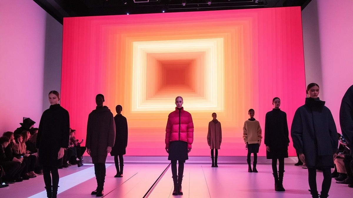 Создано на основе запроса: row of models wearing UNIQLO pufftech standing in front of MOMA monolith screen showing rafael rozendaal