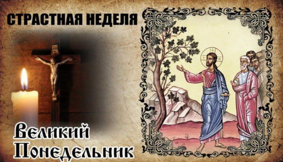 Великий понедельник и начало Страстной недели Последняя неделя Великого поста. В этот период верующие вспоминают Тайную вечерю, а также события, связанные с предательством и распятием Иисуса Христа. Страстной неделю называют, поскольку в церковнославянском языке слово "страсть" означает "страдание". Еще один сюжет, актуальный в Великий понедельник - проклятие Иисусом бесплодной смоковницы. Образ смоковницы символизирует душу, которая не дает духовных плодов, не совершает добрых дел, молитвы, не верует и не знает покаяния.