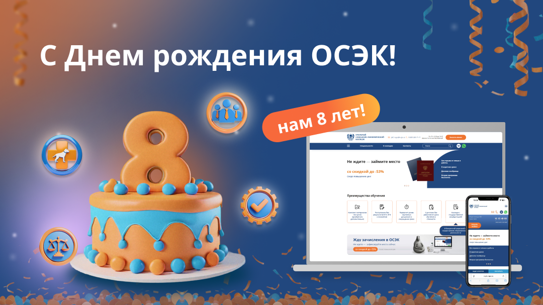 Друзья! Сегодня, 14 апреля, мы празднуем День рождения нашего колледжа. Целых 8 лет роста, развития и заботы о каждом студенте. За это время мы помогли тысячам людей получить востребованные профессии и построить карьеру, не выходя из дома. Благодарим всех, кто прошел этот путь вместе с нами — студентов, преподавателей, сотрудников. Мы рады делать образование доступным, а знания — по-настоящему нужными. С днём рождения, ОСЭК! Идем дальше вместе. 🚀 А пока вы задуваете свечки на нашем замечательном торте и пишите поздравления в комментариях, мы готовим для вас чудесный праздничный сюрприз. Следите за нашими публикациями 🧡
