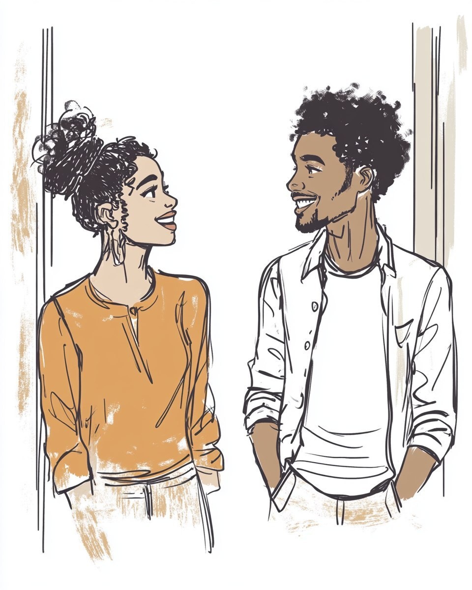 Создано на основе запроса: comic style sketch of two African Americans in an elevator, smiling and having a conversation, standing well