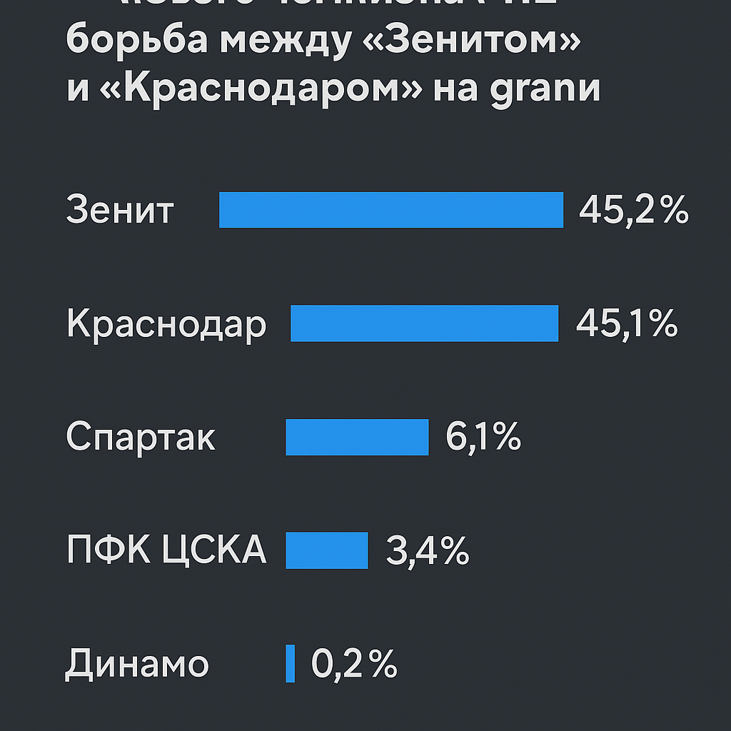 По оценкам суперкомпьютера, петербургский клуб имеет 45,2% вероятности стать чемпионом, а «быки» из Краснодара — 45,1%. Разница — всего 0,1%, что говорит о максимально плотной конкуренции. Несмотря на то что «Краснодар» лидирует в таблице с 52 очками, а «Зенит» идёт вторым с 50, аналитическая модель отдает минимальное предпочтение команде Сергея Семака, исходя из статистики и ожидаемых результатов оставшихся матчей.