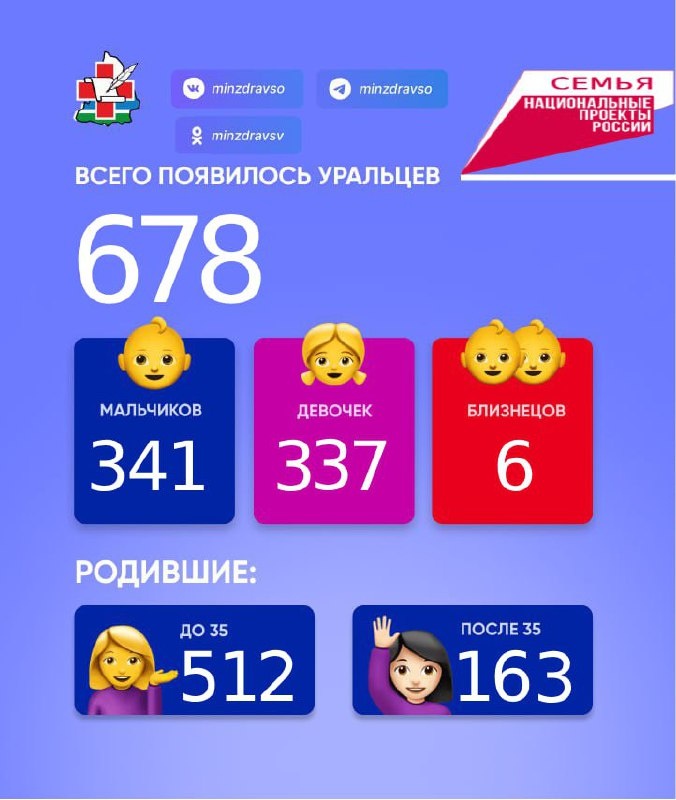 😍За прошедшую неделю в Свердловской области на свет появились 678 малышей: 341 мальчик и 337 девочек, из них 3 пары близнецов. 512 мам родили до 35 лет. 163 мамочки родили после 35 лет. Для одной свердловчанки это были седьмые по счету роды, а 120 новорожденных стали третьим детьми у своих мам. @zg66