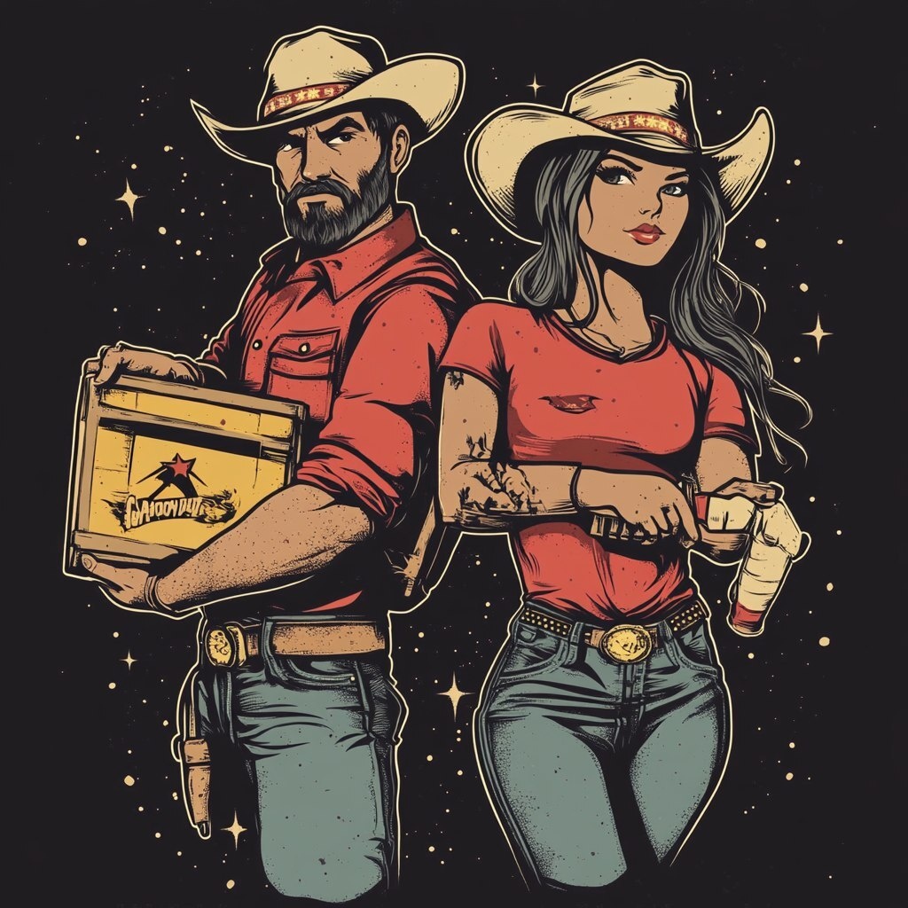 Создано на основе запроса: vector mechanic holding case of beer with cowgirl holding his arm logo