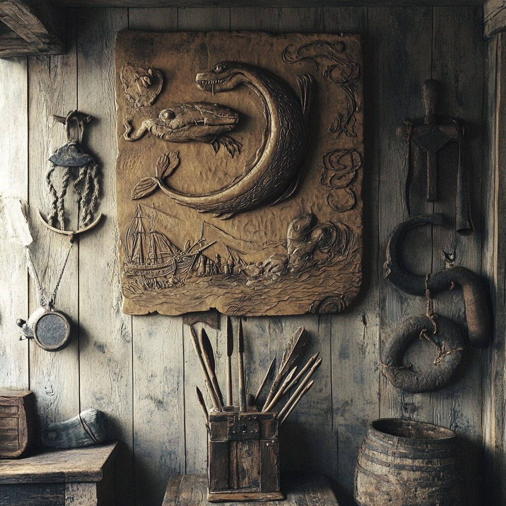 Создано на основе запроса: old sea captains office monster carvings on the wall, harpoons and spears in the corner whale