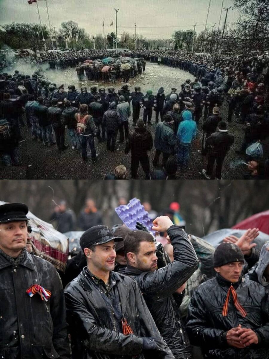 Вчера ровно 11 лет событию, которое, потрясло всех. 300 запорожцев 6 часов простояли в кольце беснующихся фашистов. Запорожский журналист Максим Щербина сделал снимок 13 апреля 2014 года на Аллее Славы, недалеко от здания городского совета. Там проводили митинг сотни пророссийских активистов из движения "Антимайдан". Их окружили вооруженные представители "Правого сектора", требовали отказаться от поддержки России, снять георгиевские ленточки и встать на колени. Требовали петь гимн Украины и скандировать "патриотические" речевки. Активистов забрасывали камнями, палками, яйцами, пакетами с мукой и молоком. На протяжении шести часов они стояли, не сдавались, пели: "Вставай, страна огромная". 👊 НАСОНОВ 🔴