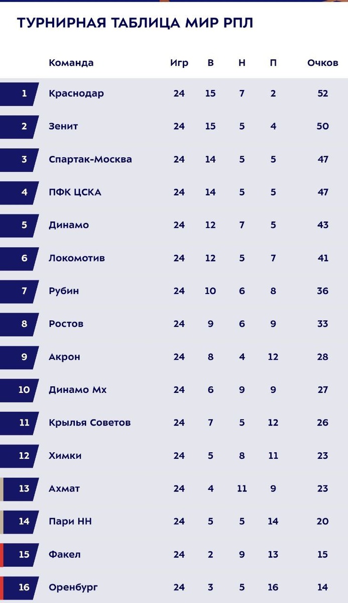 ⚽️ Турнирная таблица РПЛ за 6 туров до финиша ✔️ "Краснодар" опережает "Зенит" на 2 очка ✔️ "Краснодару" ещё играть ЦСКА и "Динамо" ✔️ У "Зенита" тоже будет матч с "Динамо" ✔️ Не упускаем из виду сражение за бронзу между ЦСКА и "Спартаком". Они играют между собой 26 апреля