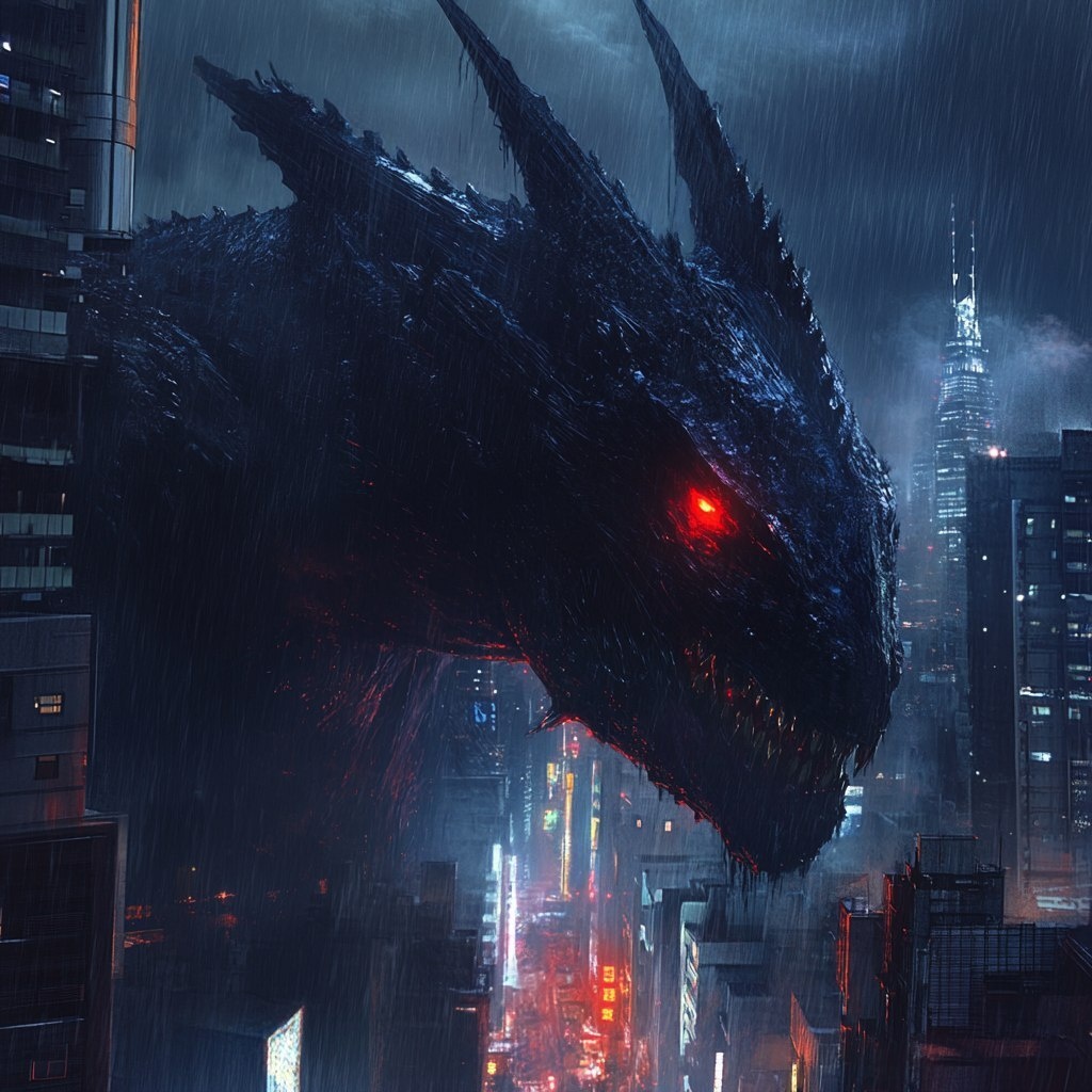 Создано на основе запроса: a giant dark blue Kaiju with red eyes with one giant sharp horn on the front of it’s face in a futuristic city dark and rainy from a far pov --- Автоперевод: Гигантский темно -синий кайджу с красными глазами с одним гигантским острым рогом на передней части лица в футуристическом городе темный и дождливый Классно получилось? 🤔 https://dzen.ru/id/65c0c65c86e4f837c27b24d7 #ИИ #AI #нейросеть #midjourney #art