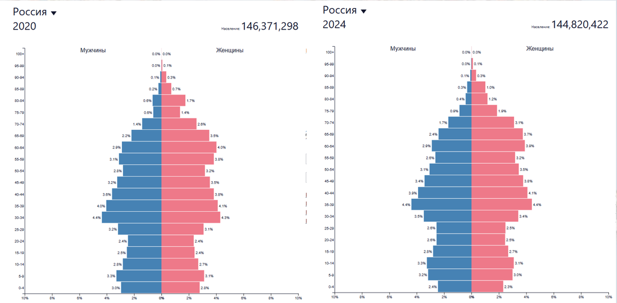 Ход работы: 1.Выберите две половозрастных пирамиды населения России разных лет. 2.Рассчитайте долю молодого населения (до 15 лет) в общей численности населения страны. (2020 г. :3,0%+3,3%+2,8%+2,8%+3,1%+2,7%=17,7% 2024 г. : 2,4%+3,2%+3,3%+2,3%+3,0%+3,1%=17,3%) 3.Рассчитайте долю населения среднего возраста (от 15 до 65 лет) в общей численности населения страны. (2020 г.: 2,5%+2,4%+3,2%+4,4%+4,0%+3,6%+3,2%+2,8%+3,1%+2,9%+2,4%+2,4%+ +3,1%+4,3%+4,1%+3,8%+3,5%+3,2%+3,8%+4,0%= 66,7 % 2024 г.: 2,8%+2,6%+2,6%+3,5%+4,4%+3,9%+3,4%+3,1%+2,6%+2,9%+2,8%+2,5%+ +2,5%+3,4%+4,4%+4,1%+3,8%+3,5%+3,2%+3,9%=65,9%) 4.Рассчитайте долю пожилого населения (старше 65 лет) в общей численности населения страны. (2020 г.: 2,2%+1,4%+0,6%+0,6%+0,2%+0,1%+0,0%+0,0%+3,5%+2,6%+1,4%+1,7%+ +0,7%+0,3%+0,1%+0,0%=15,4%; 2024 г.: 2,4%+1,7%+0,9%+0,4%+0,3%+0,1%+0,0%+0,0%+3,7%+3,1%+1,9%+1,2%+ +1,0%+0,3%+0,1%+0,0%=17,1 %) 5.Определите соотношение доли молодых и доли старших возрастов в населении России. (2020 г. : соотношение до