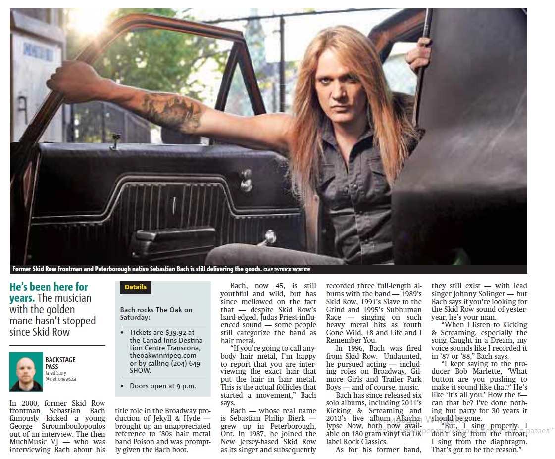 Газета Metro – Winnipeg. 27 июня 2013 В 2000 бывший фронтмен SKID ROW Себастьян Бах выгнал молодого Джорджа Струмбулопулоса с интервью. Тогдашний виджей MuchMusic, бравший интервью у Баха о его главной роли в бродвейской постановке Джекилл и Хайд, сделал отсылку к глэм-метал-группе восьмидесятых POISON и был немедленно отправлен в отставку Бахом лично. Бах, которому сейчас 45 лет, по-прежнему молод и энергичен, но с тех пор смягчился, узнав, что, несмотря на жесткое звучание SKID ROW, вдохновленное JUDAS PRIEST, некоторые по-прежнему относят группу к жанру глэм-метал. «Если ты собираешься назвать кого-либо хейр-металом, то я рад сообщить, что ты берешь интервью у того самого хаера, которые и привели его в движение. Эти волосяные фолликулы положили начало хейр-металу», – говорит Бах. Бах, настоящее имя которого Себастьян Филипп Бьёрк, вырос в Питерборо, Онтарио. В 1987 он присоединился к группе SKID ROW из Нью-Джерси в качестве фронтмена, а затем записал с группой три полноформатных ал