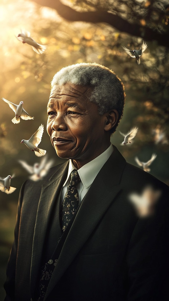 Создано на основе запроса: Nelson Mandela standing with a peaceful expression, surrounded by doves and sunlight, soft focus, inspiring