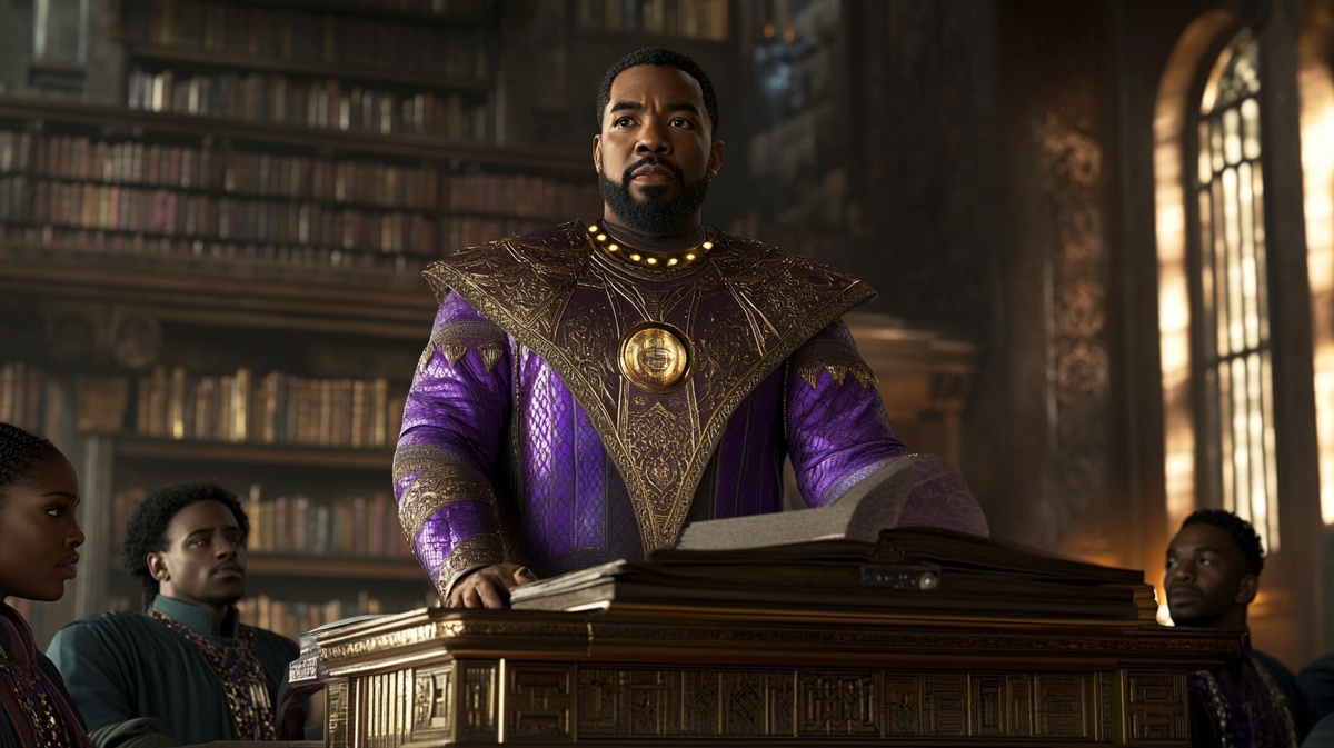 Создано на основе запроса: A confident African American man with a well-groomed beard stands proudly behind a podium in a grand library. He exudes a powerful presence, wearing a striking, futuristic royal garment adorned in deep purple and gold hues, which gleams with intricate designs. The man is teaching and engaging a group of attentive African American individuals seated at tables within the library. The atmosphere is one of respect and learning, with bookshelves lined with knowledge in the background. The library's elegant architecture enhances the scene, highlighting the man’s commanding yet noble role as a teacher and leader. --- Автоперевод: Уверенный афроамериканец с ухоженной бородой гордо стоит за подиумом в Большой библиотеке. Как тебе такой вариант? 🤔 https://dzen.ru/id/65c0c65c86e4f837c27b24d7 #ИИ #AI #нейросеть #midjourney #art