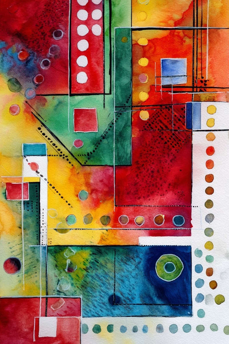 Создано на основе запроса: A watercolor painting of an abstract composition with geometric shapes and bold colors, including reds, greens