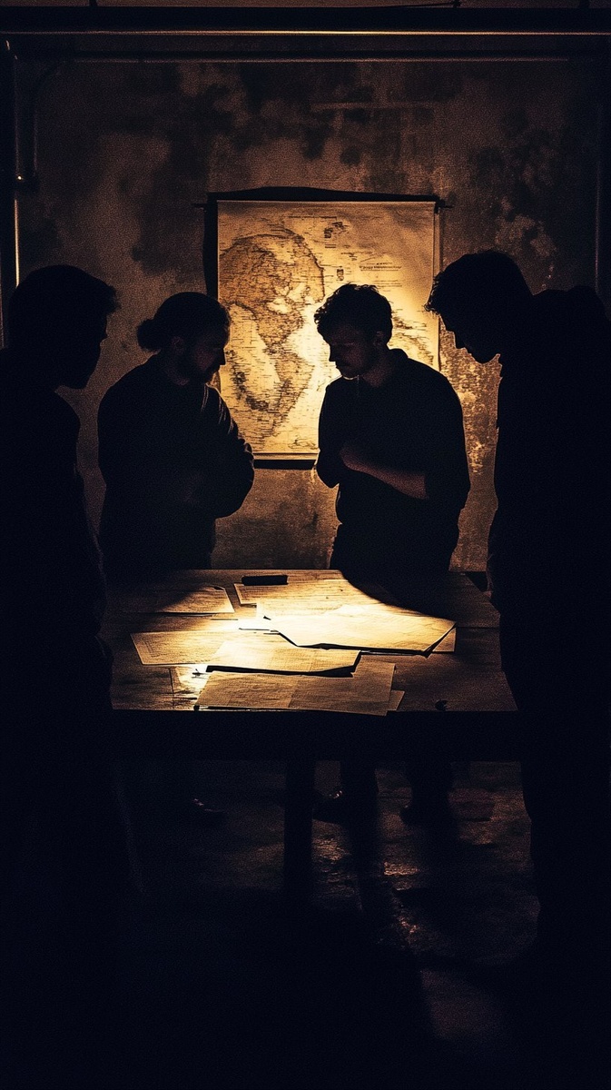 Создано на основе запроса: Silhouettes of figures meeting secretly at night, underground bunker, revolutionary energy, map and documents on