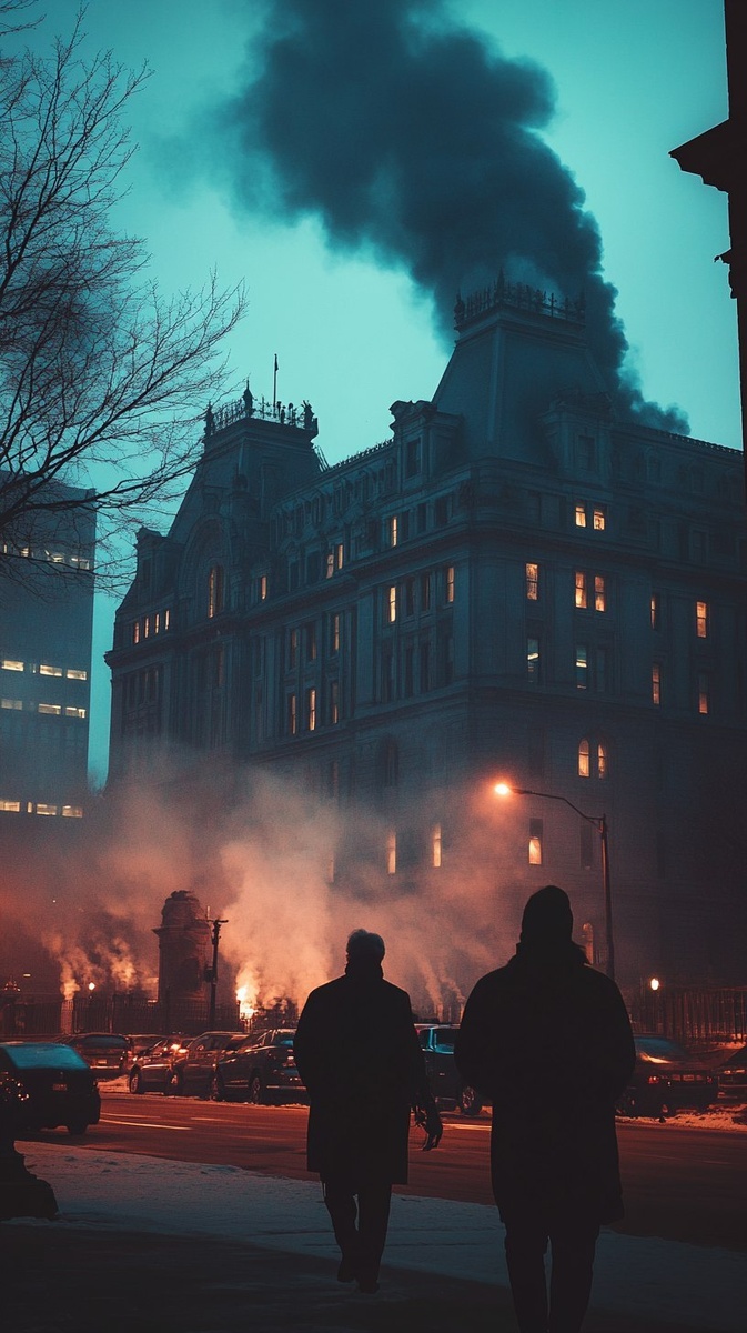 Создано на основе запроса: City government building with smoke rising in the distance, viewed from behind observers, somber tone, twilight