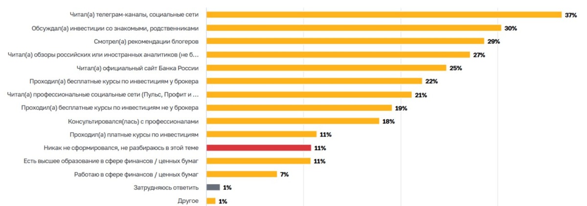 Портрет российского инвестора https://www.cbr.ru/analytics/szpp/fin_literacy/issledovanie-investicionnoy-gramotnosti/ Узнали себя ⁉️ Главное, что мне понравилось - влияние телеграм-каналов и мнение соседа. Сто лет уже о таком говорю и пишу, так не верят же никак. 👉 Основные источники информации для принятия инвестиционных решений – это телеграм-каналы и социальные сети (37%), обсуждения со знакомыми (30%), рекомендации блогеров (29%) 🤡