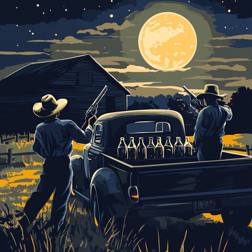Создано на основе запроса: vector cowboys holding vintage tommy guns rifles, loading the back of vintage truck with moonshine bottles in