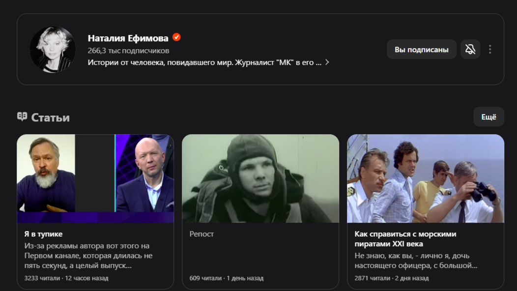 Подписан на журналиста Наталию Ефимову. По многим вопросам мы вообще на одной "советской" волне. Статья "Я в тупике" - зацепила, там про Кузичева и какого-то приглашенного на 1-й НЕ ИНОАГЕНТА, книги и произведения которого НЕ ЗАПРЕЩЕНЫ. Наталия провела работу https://dzen.ru/a/Z_oNvaNckBbZ4zQb, а не просто так выплеснула свои эмоции на своем блоге. То есть даже беглого прочтения всех "заслуг" приглашенного на первый канал какого-то "философа" с ой какой философской фамилиёй хватает, чтобы понять, какое перед нами "светило" отсвечивает, а первый канал - известное место, где подобные собираются благодаря "великому" Косте. Если кто до сих пор ещё не понял. Зашел к Кузичеву на ТГ канал, потому что уже давно вижу, что скурвился "ВДВшник для хайпа". И точно, какие-то оправдашки: Комментариев ему там напихали полно, есть разные - но в целом понятно отношение людей к нему. И я засунул пару, объяснил свое отношение именно к этому поведению, оправданиям и все такое. Не стесняясь. А все можно с