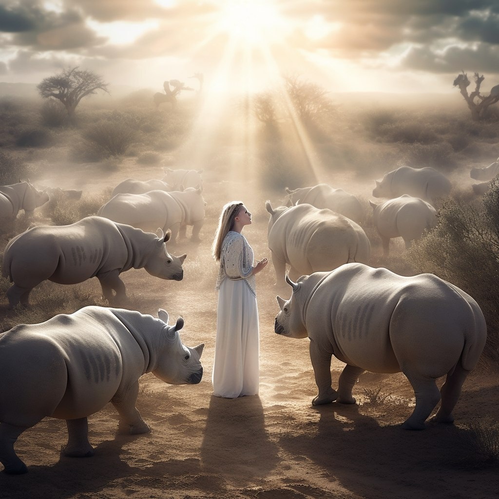 Создано на основе запроса: woman in the middle of a holy array of norther white rhinos, the lord of tbe rhinos, god rays