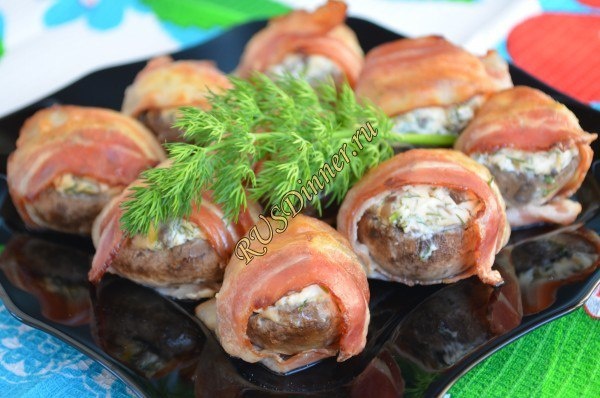 Фаршированные шампиньоны в беконе От автора: Фаршированные шампиньоны в беконе - это очень вкусное и не обычное блюдо, у меня просто нет слов для описания, их просто надо готовить и кушать. Ингредиенты: Творожный сыр Natura - 100 гр. Грибы шампиньоны - 250 гр. Укроп - 1 пуч. (достаточно будет половины пучка) Лук репчатый - 1 шт. Бекон сырокопченый нарезка - 100 гр. Масло растительное - 30 мл. Источник: https://rusdinner.ru/page/farshirovannye-shampinony-v-bekone