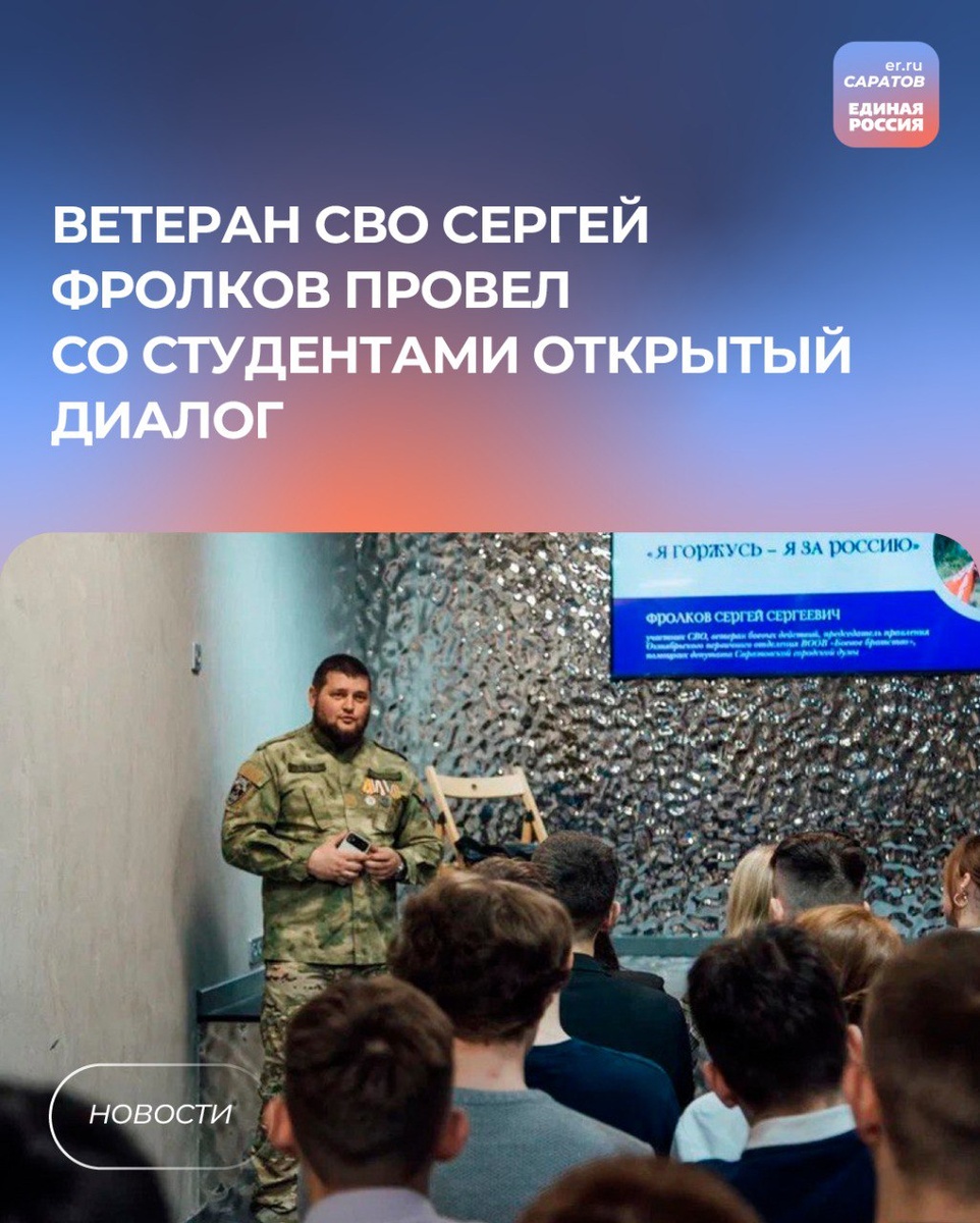 🗣️Встреча состоялась на площадке Саратовской государственной юридической академии. Участник специальной военной операции, ветеран боевых действий, активист Штаба общественной поддержки «Единой России» Сергей Фролков провел открытый диалог на тему «Я горжусь – я за Россию». Сергей поделился со студентами своими впечатлениями о происходящем на Украине и в зоне СВО. Рассказал о том, как наши бойцы сражаются с нацизмом, защищая мир и независимость нашей страны, а также о важности службы в армии и добросовестном выполнении гражданского и воинского долга перед Отечеством. 💬«Получился интересный открытый диалог с ребятами. Ответил на все вопросы, включая о том, что меня сподвигло стать участником СВО. И поделился подробностями о своей общественной деятельности, которую активно веду в настоящее время», - рассказал Сергей Фролков.
