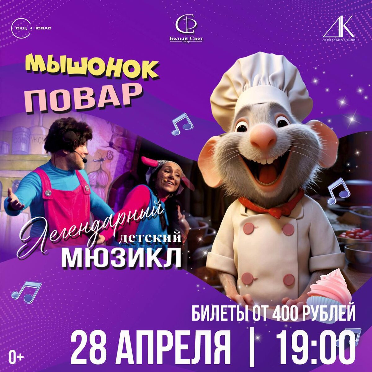 ☺️ Приглашаем посетить увлекательный мюзикл для всей семьи “Мышонок Повар”, показ которого состоится 28 апреля в 19:00 на сцене театрального