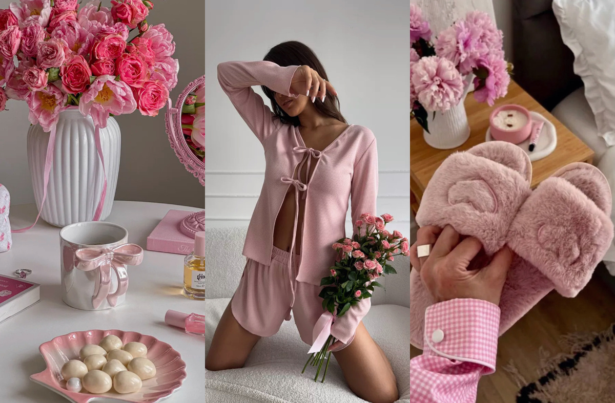 Домашний образ состоит из розового костюма с шортами и кофтой на завязках, что придает ему уютный и стильный вид. Костюм отлично подходит для комфортного отдыха дома. Розовые меховые тапочки добавляют уюта и тепла, обеспечивая комфорт на каждом шагу. Кружка с бантиком добавляет нотку игривости и красоты, а розовая заколка-крабик позволяет аккуратно собрать волосы, завершая образ. Такой комплект идеально подходит для расслабляющих вечеров или субботних утра в домашней обстановке.