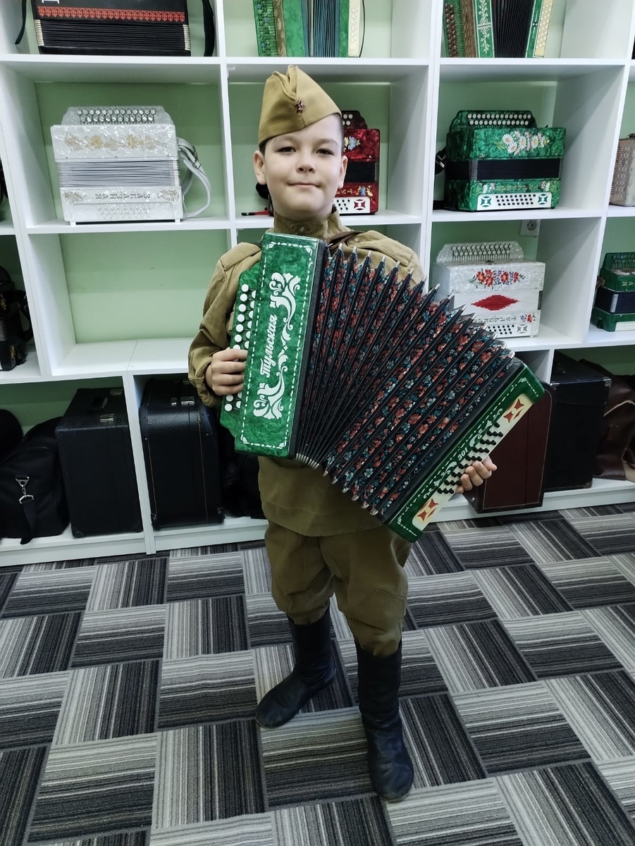 Он - праправнук участника Великой Отечественной войны Файзуллы Мулюкова. Арслан играет на гармони, как и Файзулла Зиннатович. На фото также другие члены семьи Мулюкова.