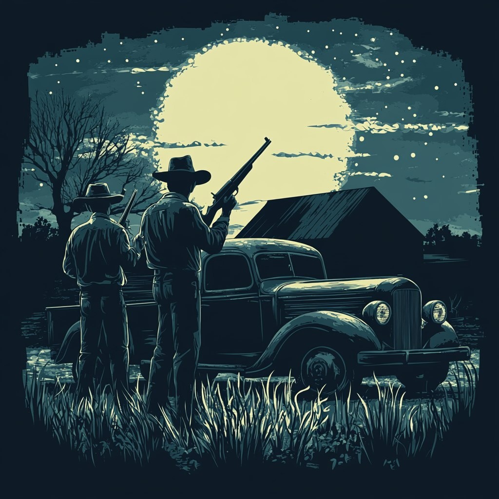 Создано на основе запроса: vector cowboys holding rifles, on side of vintage moonshine truck, in tennessee farm barn during night with moon