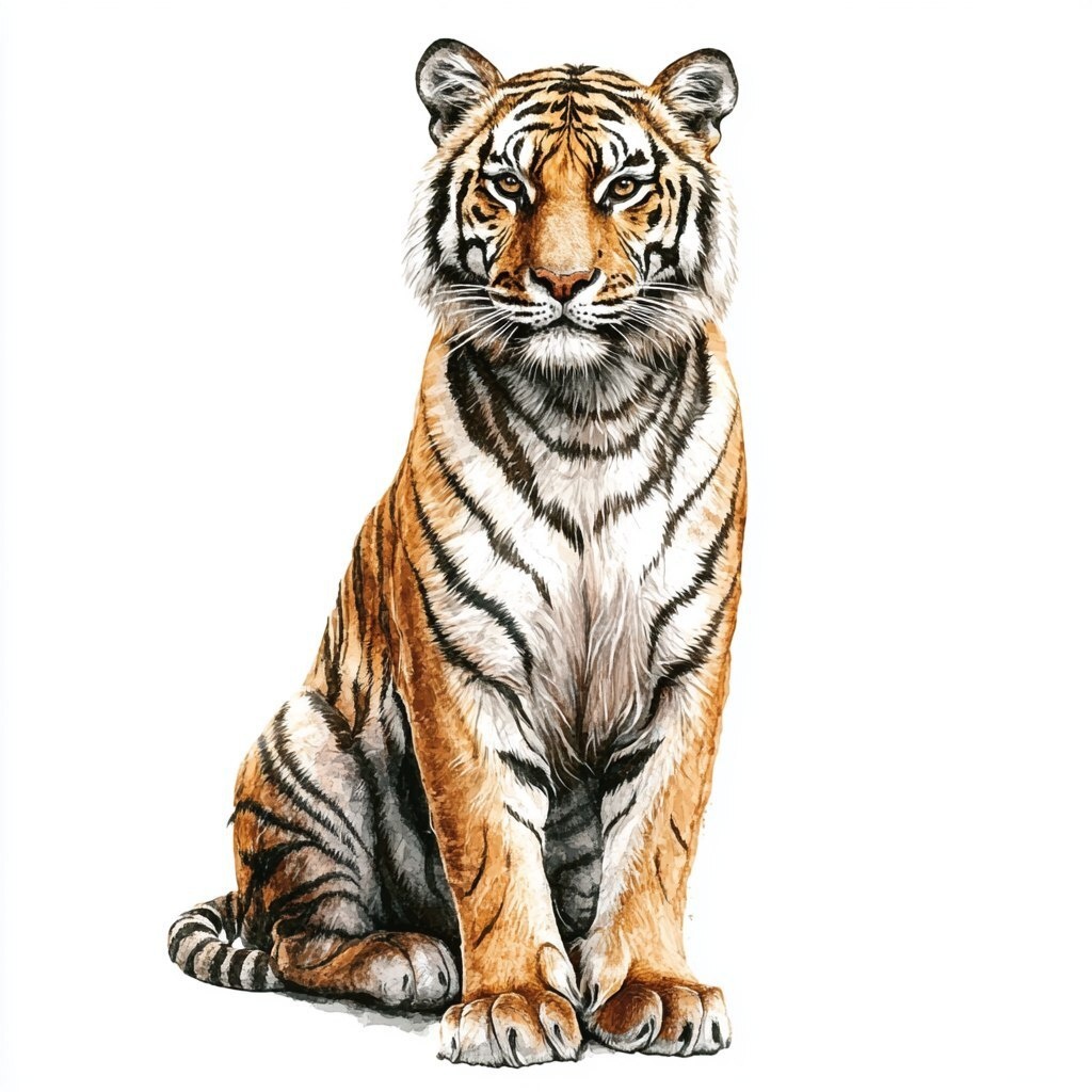 Создано на основе запроса: an illustration of a single isolated tiger sitting on front haunches facing the camera. Tiger to be tall and thin. No other design elements around it, only the tiger. Make it appear like a detailed watercolor --- Автоперевод: Иллюстрация одного изолированного тигра, сидящего на передних руках, обращенных к камере. Как тебе вариант? 🤔 https://dzen.ru/id/65c0c65c86e4f837c27b24d7 #ИИ #AI #нейросеть #midjourney #art