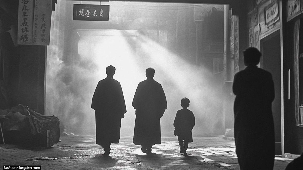 Создано на основе запроса: A black and white photo of the web page for "fashion-forgotten men" showing an old movie still from Hong Kong in