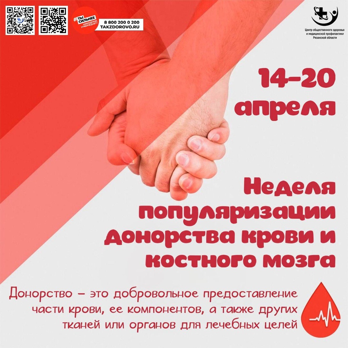 🗓 В России стартовала неделя популяризации донорства крови и костного мозга (в честь Дня донора в России 20 апреля). ☝ Научными исследованиями и практическими наблюдениями доказано, что сдача крови в дозе до 500 мл совершенно безвредна и безопасна для здоровья человека. Периодические донации крови оказывают благоприятное стимулирующее воздействие на организм донора. ✅ Донорство – почетная и полезная миссия. Помните, что сдавая кровь, вы спасаете чьи-то жизни. #здоровоебудущее #здоровоебудущее62 #ЗдороваяРязань