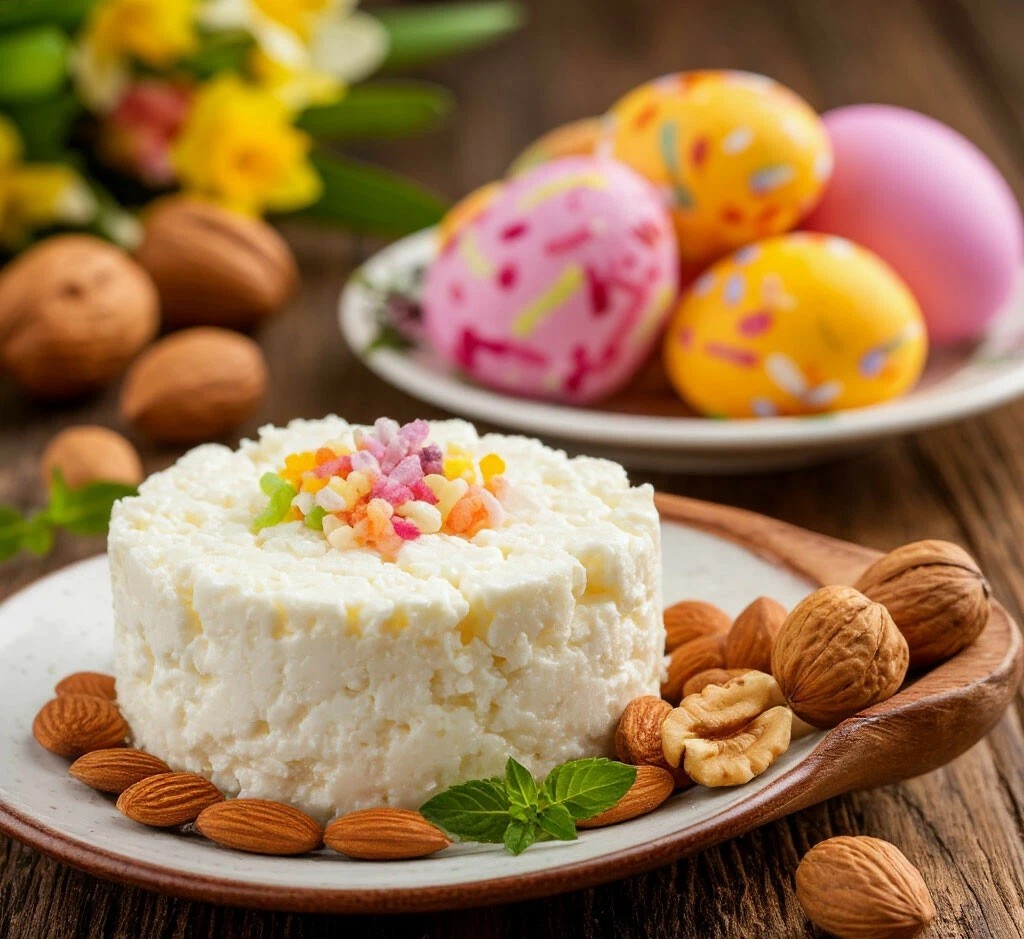 Пасха из творога — традиционное угощение на светлый праздник Воскресения Христова. Этот десерт отличается нежной текстурой, приятной сладостью и насыщенным вкусом. Добавление орехов придаст пасхе приятную хрусткость и пикантный аромат. Ингредиенты: - Творог — 500 г (лучше брать сухой, рассыпчатый или протереть через сито) - Сливочное масло — 100 г (размягчённое) - Сахар — 100–150 г (по вкусу) - Яйца — 2 шт. (желтки) - Сметана (20–30%) — 100 г - Ванильный сахар — 1 ч. л. - Лимонная цедра — 1 ч. л. (по желанию) - Грецкие орехи — 100 г (можно заменить миндалём, фундуком или смесью) - Цукаты или изюм — 50 г (по желанию) - Если творог зернистый, протрите его через сито или измельчите блендером до однородности. - Смешайте с мягким сливочным маслом, сахаром и ванилью. - Отделите желтки от белков (белки не понадобятся). - Взбейте желтки со сметаной и добавьте к творожной массе. - Подсушите орехи на сухой сковороде и измельчите (не слишком мелко).