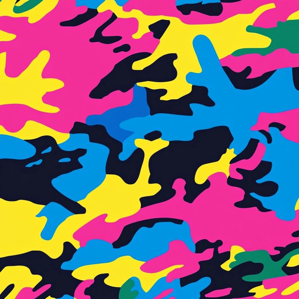 Создано на основе запроса: military camouflage pattern in neon colors like pink, blue, yellow, and green, reminiscent of the 1990s and 2000s