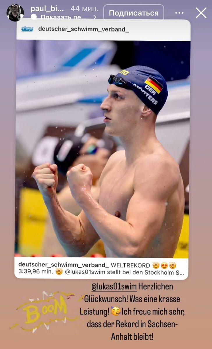 Paul Biedermann поздравил Lukas Martens с новым рекордом мира на дистанции 400 вольный подписав «От всего сердца поздравляю! Потрясающее достижение! Я рад, что рекорд останется в Саксонии-Анхальт»