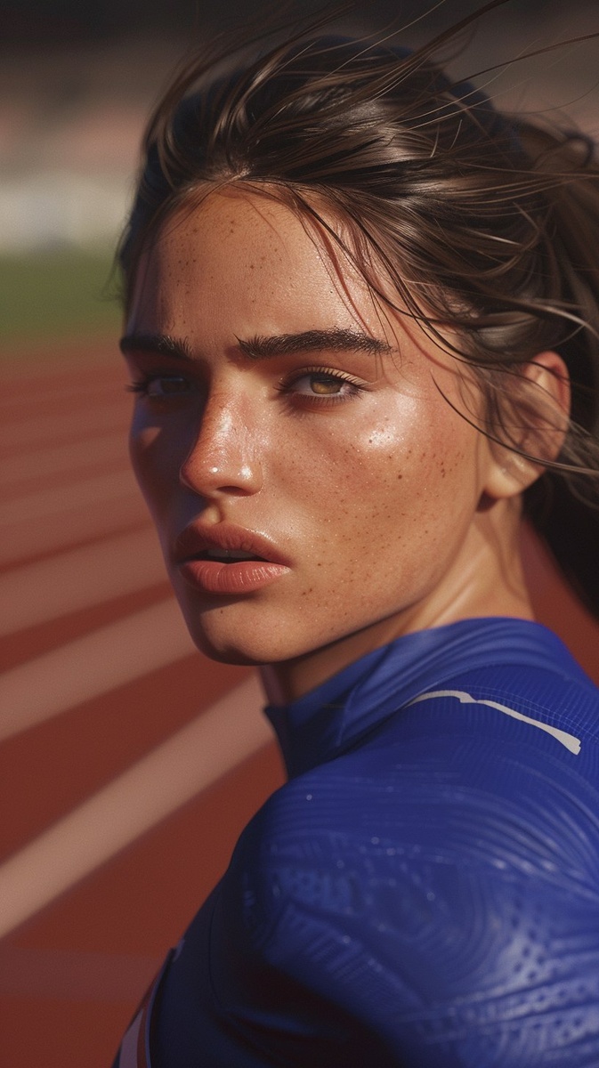 Создано на основе запроса: a beautiful italian girl 19 year-old with, brown hair tied back, wearing a blue tight track-and-field uniform, in