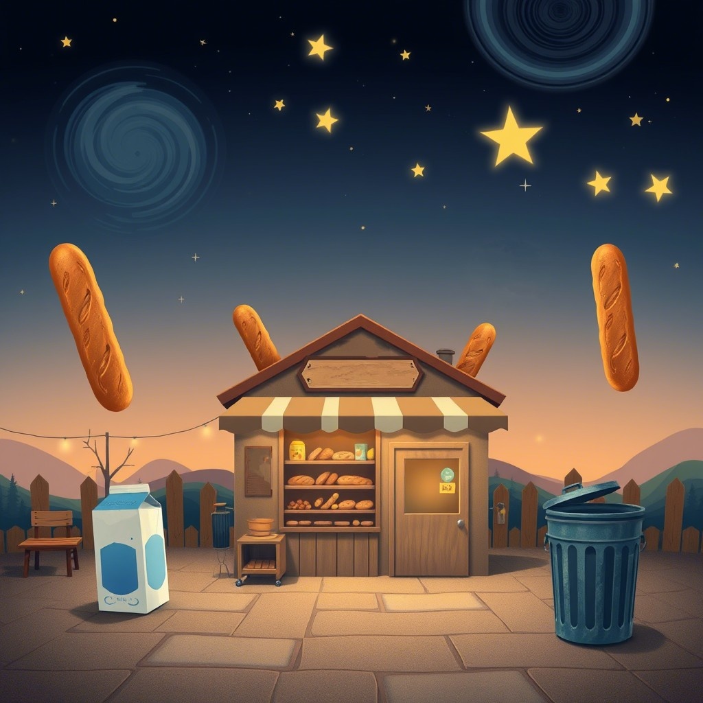 Всё началось с того, что Бузяка внезапно осознал: если он немедленно не купит хлеб, вся реальность рухнет. "Понимаешь," - объяснял он Кутяпке, пытаясь одновременно держать равновесие на одной ноге и изучать пятно на потолке, "хлеб - это квантовый стабилизатор нашей вселенной. Без него даже тостеры начнут философствовать!" "О-о-о!" - восхитилась Кутяпка, уже успевшая связать все шнурки в доме в один гигантский узел. "Значит, мы как бы спасители мира?" "Вот именно!" - важно кивнул Бузяка. "Но помни: главное правило миссии - ни в коем случае не смотреть в глаза говорящим батонам!" И тут в дверь влетел (буквально) новый персонаж - Пыхтюк-Обратный, который умел ходить только задом наперёд и считал себя специалистом по паранормальным явлениям. "Я знал, что вы отправитесь за хлебом!" - заявил он, поправляя свои очки, которые носил вверх ногами. "Но вы забыли самое главное: без защиты от космических лучей молочных пакетов нам всем конец!" "Это ещё почему?" - удивилась Кутяпка, уже успевш
