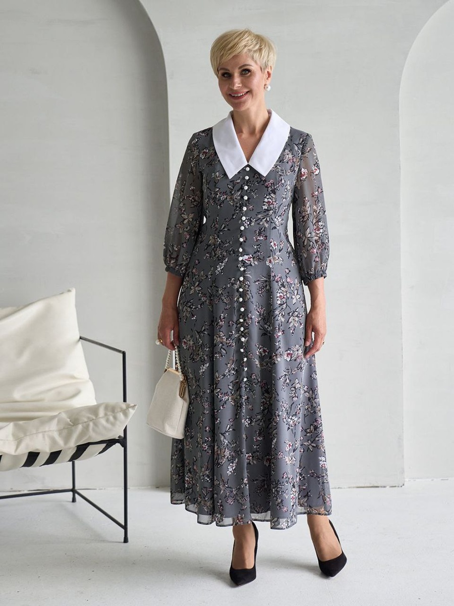 Красивейшее благородное платье с жемчужными пуговками с цветочным принтом и белым воротничком, который отстёгивается