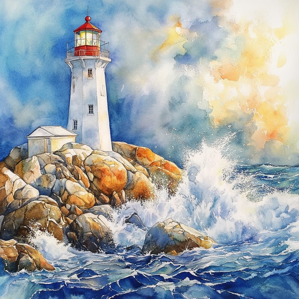 Создано на основе запроса: Lighthouse on rocks waterclour