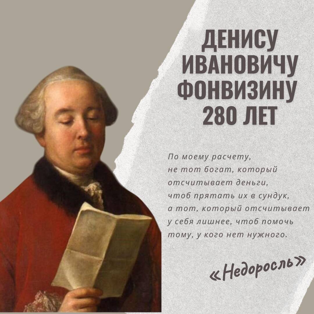 «Ничто в Петербурге так меня не восхищало, как театр, который я увидел в первый раз от роду; играли русскую комедию, как теперь помню: „Генрих и Пернилл“ Хольберга. Тут видел я Шумского, который шутками своими так меня смешил, что я, потеряв благопристойность, хохотал изо всей силы». Д. И. Фонвизин Сегодня исполняется 280 лет со дня рождения Дениса Ивановича Фонвизина, автора пьес «Бригадир» и «Недоросль» — первых комедий нравов в русском театре. «Эта пьеса — бесподобное зеркало. Фонвизину удалось стать прямо перед русской действительностью, взглянуть на неё просто, непосредственно, в упор...», — так говорил о комедии «Недоросль» историк театра Борис Ключевский. Премьера состоялась в 1782 году в Петербургском Вольном театре (Театр Карла Книпера), хотя автору далеко не сразу удалось преодолеть цензурные препоны. В пьесе есть памятная всем сцена, когда нянька Еремеевна лезет в драку ради опекаемого ею Митрофанушки. Публику той эпохи вполне могли шокировать чересчур неприличные для же