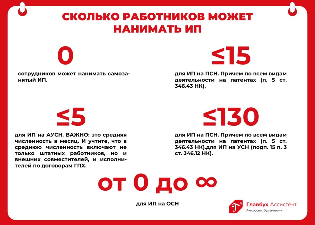 ⁉️Сколько работников может нанимать ИП Количество работников у ИП зависит от системы налогообложения, которую применяет предприниматель. Смотрите, какие лимиты вы должны соблюдать ⬆️ #ГлавбухАссистент_инфографика 📈 Налоги для предпринимателей: про налоги простым языком