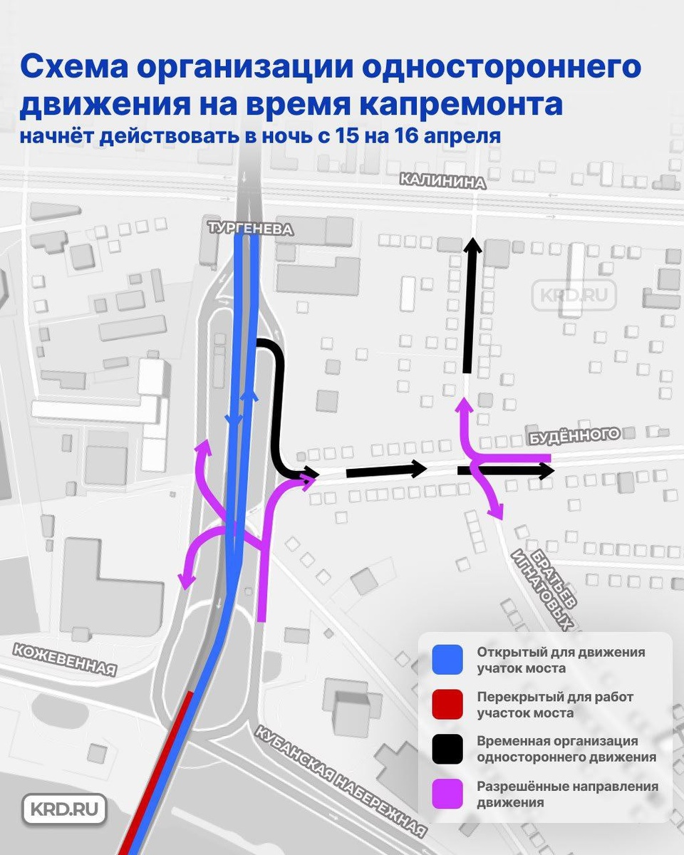 В ночь с 15 на 16 апреля будет изменена организация дорожного движения вблизи Тургеневского моста Это связано со стартом первого этапа капитального ремонта моста. На дорогах будут установлены временные дорожные знаки и светофоры, нанесена временная разметка. Изменения: ➖ спуск с моста станет односторонним ➖ участок улицы Будённого от Тургенева до Братьев Игнатовых станет односторонним ➖ участок улицы Братьев Игнатовых от Будённого до Калинина станет односторонним ➖ при движении по Будённого в сторону моста, на перекрёстке с улицей Братьев Игнатовых, можно будет повернуть лишь налево или направо ➖ при движении по улице Кубанской Набережная, в сторону Калинина, можно будет повернуть под мост или на Будённого. Движение прямо будет запрещено 👍 ТК Краснодар | Подписаться