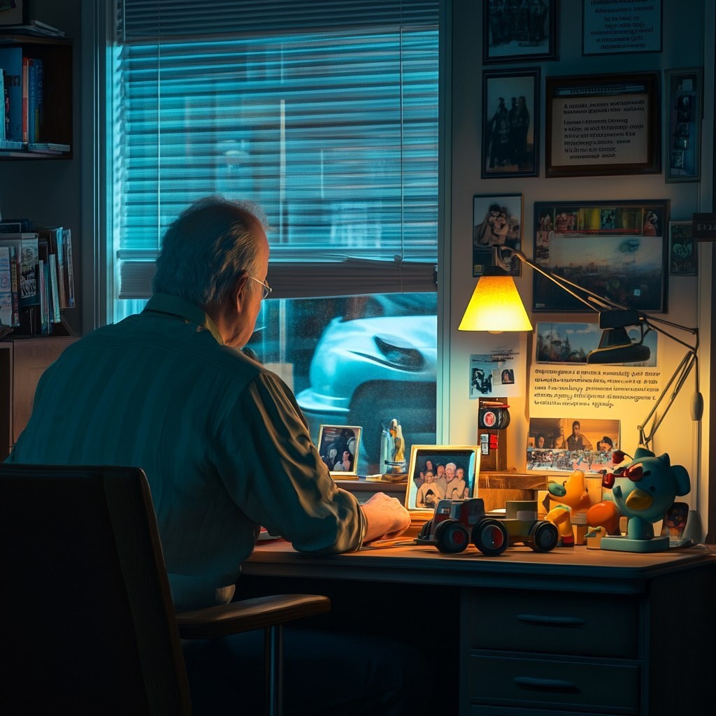 Создано на основе запроса: "A lonely adult sitting alone in an office, looking out the window with a longing expression, dim light, personal