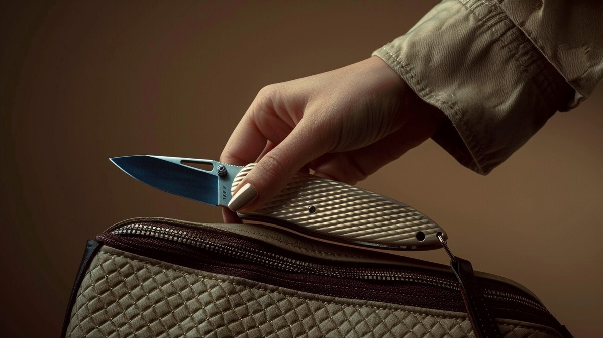 Создано на основе запроса: An elegant woman's hand carefully places a folding knife into a stylish small textured handbag