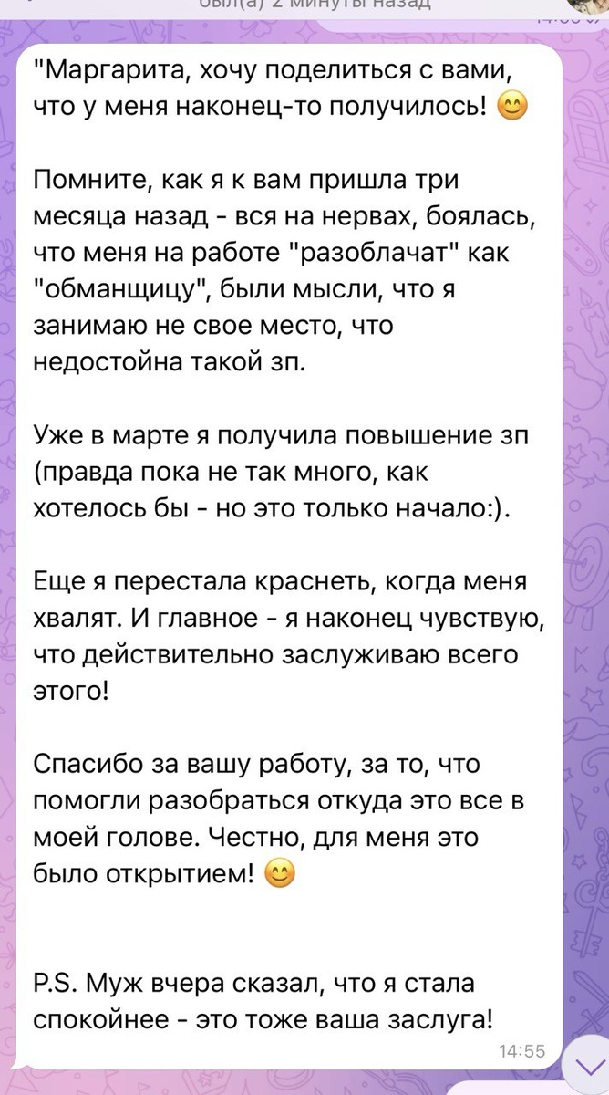 ✔ Комплименты теперь принимает с благодарностью, а не оправданиями "Теперь я знаю: мое место среди профессионалов — по праву, а не по случайности". 1️⃣ Ищем корень проблемы