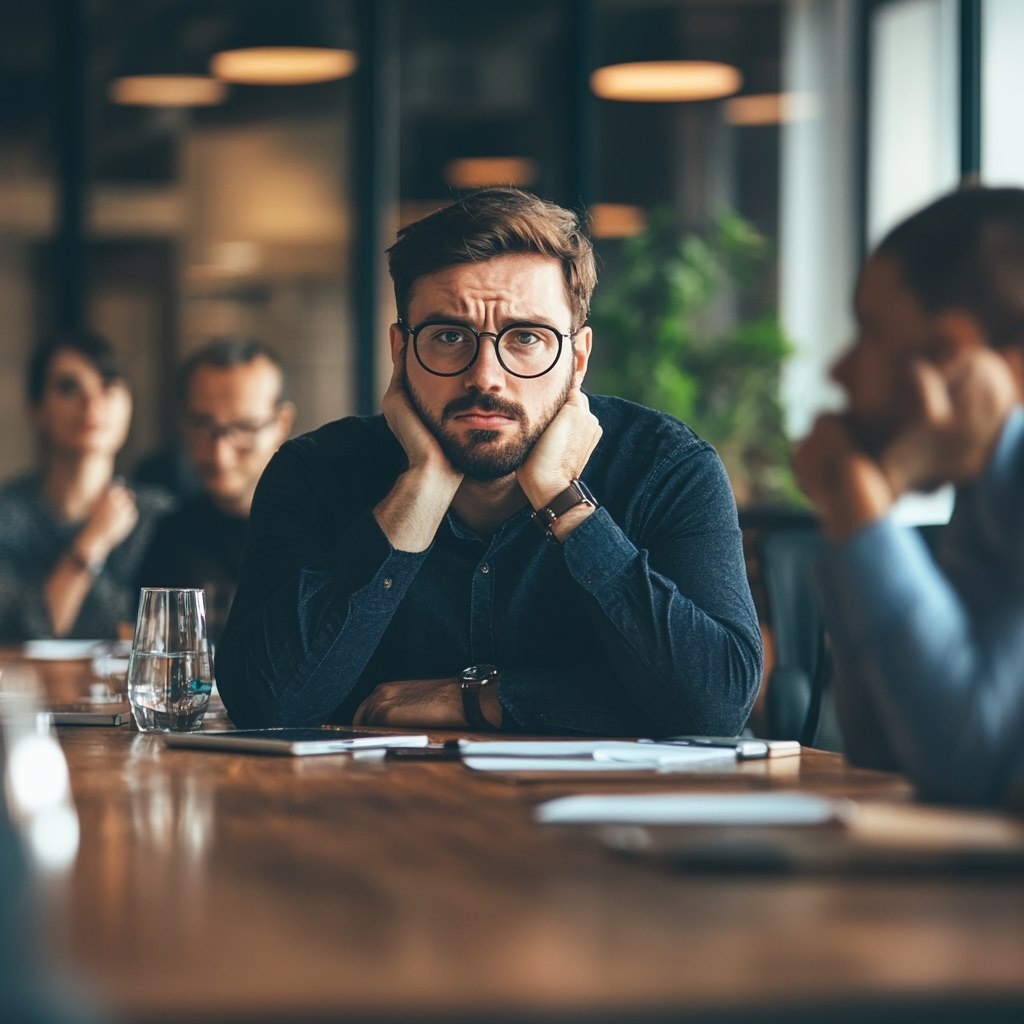 Создано на основе запроса: "The same adult looking nervous, sitting at the desk, deep in thought about an meeting presentation in a meeting