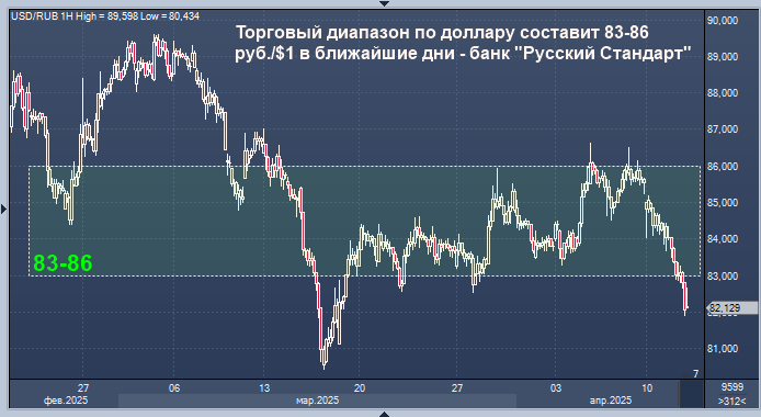 Торговый диапазон по доллару составит 83-86 руб./$1 в ближайшие дни - банк "Русский Стандарт" Курс доллара к рублю расчётный, фьючерс, вечный фьючерс и межбанк. Курс евро к рублю расчётный, фьючерс, вечный фьючерс и межбанк. Курс юаня к рублю биржевой, фьючерс, вечный фьючерс и межбанк. Торговый диапазон по доллару, скорее всего, составит в ближайшие дни 83-86 руб./$1, по евро - 95-98 руб./EUR1, полагает директор департамента операций на финансовых рынках банка "Русский Стандарт" Максим Тимошенко. Рубль, по мнению эксперта, на относительно стабильных позициях на Московской бирже. Оптимизма российскому рынку способен добавить, в том числе, и недавний визит спецпосланника президента США в Россию. При этом снижение нефтяных цен из-за опасений глобальной рецессии - не на стороне национальной валюты. "Мировые рынки, где многие участники предпочитают занять выжидательную позицию, находятся в зоне повышенной волатильности на фоне непредсказуемости тарифной политики Дональда Трампа, - отмечает