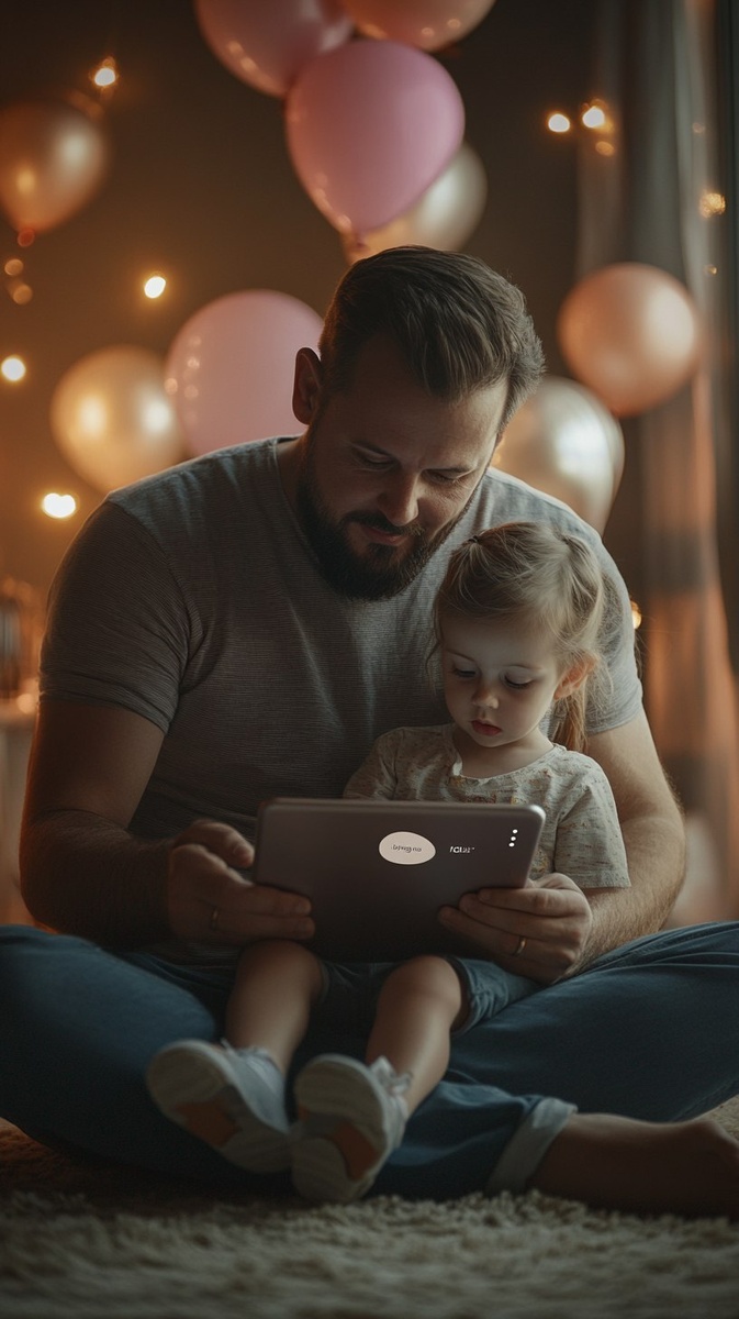 Создано на основе запроса: a photorealistic image of a caring father sitting on the floor with his child, both looking at a large tablet