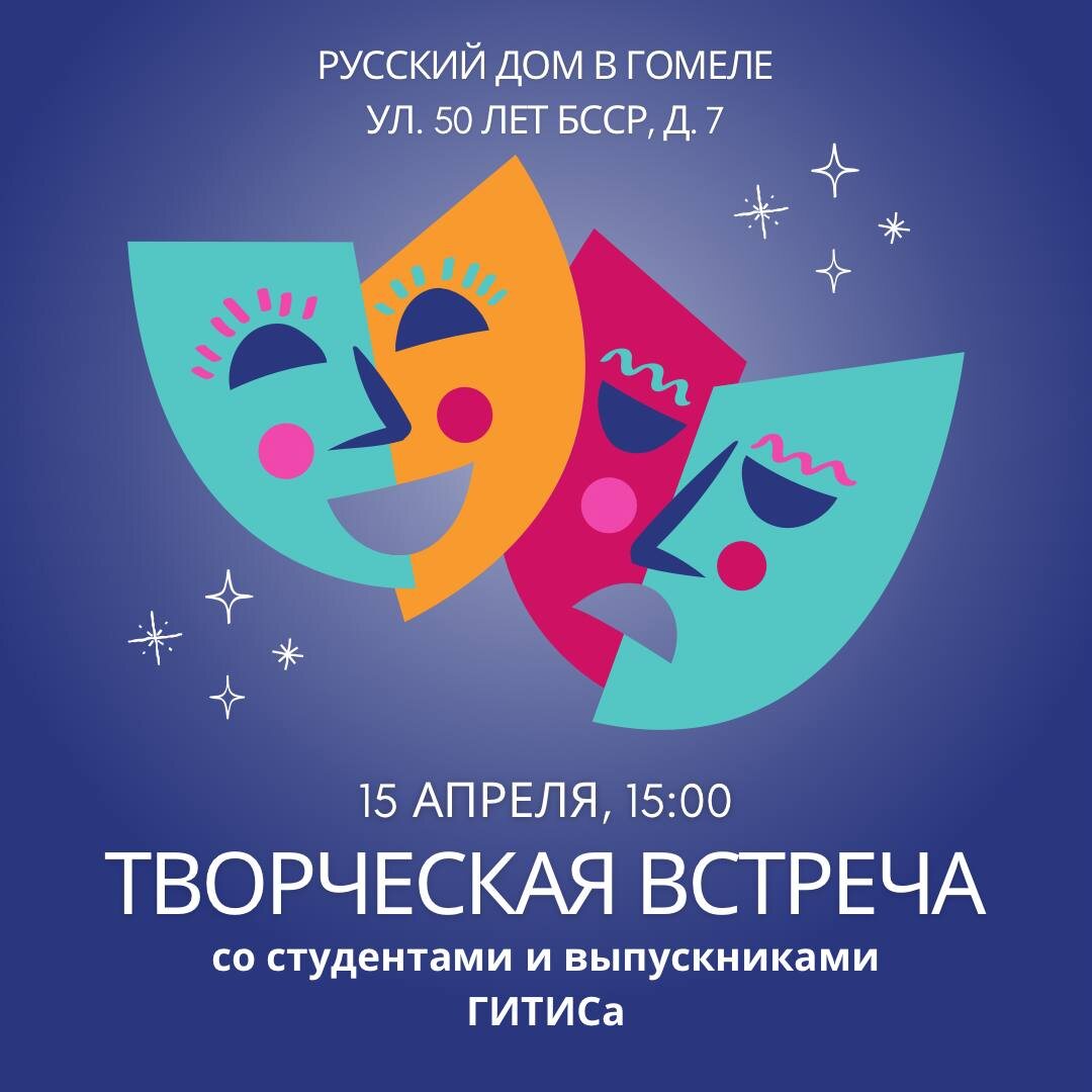 15 апреля в 15:00 ждём всех на встречу с молодыми талантами, которые приедут в Гомель, чтобы поставить спектакли в рамках проекта «Постановки студентов ГИТИСа в русских театрах за рубежом». Это уникальная возможность пообщаться с будущими звёздами театральной сцены, узнать о процессе создания спектаклей и вдохновиться творчеством! Проект реализуется при поддержке АНО «Русские сезоны» и Министерства культуры РФ. 📍 Место: Русский дом в Гомеле ☝🏻 Дата: 15 апреля 🕒 Время: 15:00 📞 Запись по телефону: 8 (0232) 31-54-15