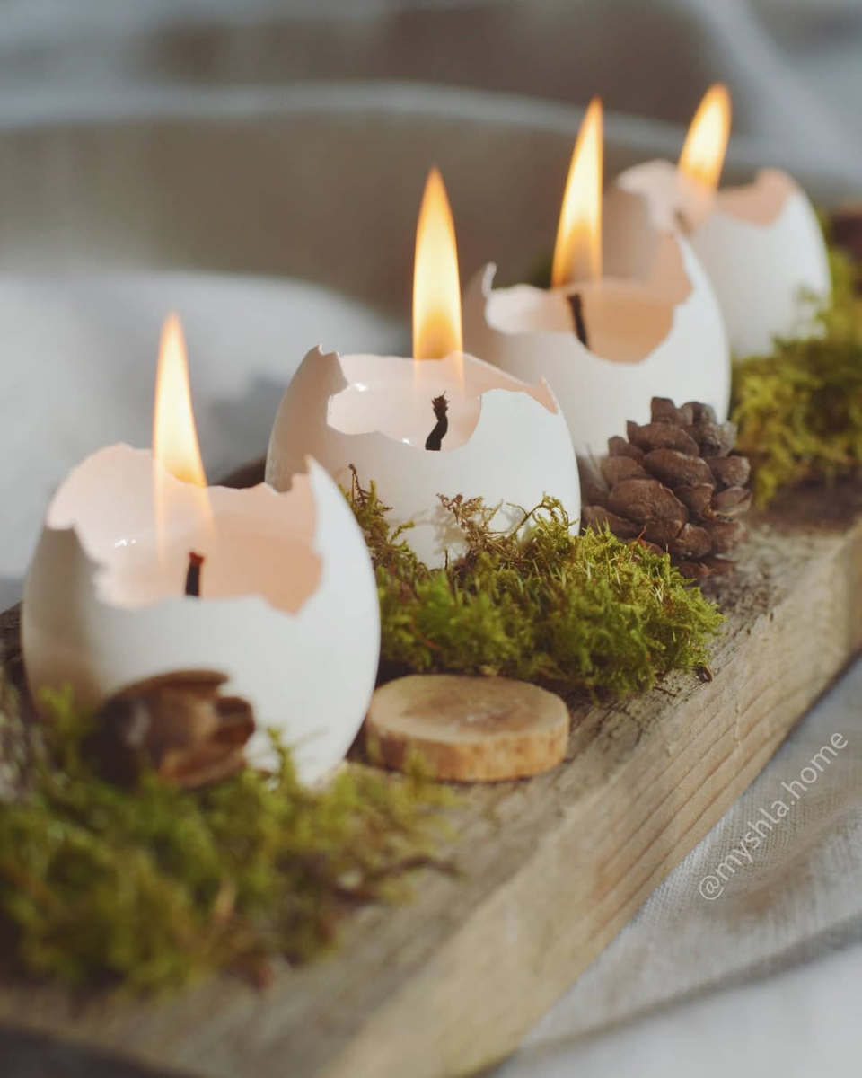Видео красивого декора Да, этот проект, казалось бы, совсем из хлама – но только посмотрите, какой трогательный и эффектный результат! А ещё он идеально подойдёт для ленивых и занятых – мне очень хотелось что-нибудь сотворить, но фантазии и сил на что-то основательное не нашлось 🤷 Поэтому я взяла старую доску из кучи за домом (они у меня там маринуются ветром, солнцем и осадками – так рождается настоящая амбарная доска 😉), несколько свечных огарков, скорлупу и немного даров леса – и смастерила эту простую композицию 🌿 Поставить на стол, украсить подоконник или комод, полку в спальне – да впрочем, не важно: главное, что даже из самых непритязательных материалов можно создать маленькое чудо ✨ 🔸 Подготовка доски – отверстия в доске я сделала с помощью сверла большого диаметра – коронки, но можно сделать углубления дремелем или круглой шарошкой – фрезой для дрели. 🔸 Подготовка скорлупы – чтобы сохранить её целой, ножом аккуратно пробила небольшое отверстие и вытряхнула содержимое. Мож